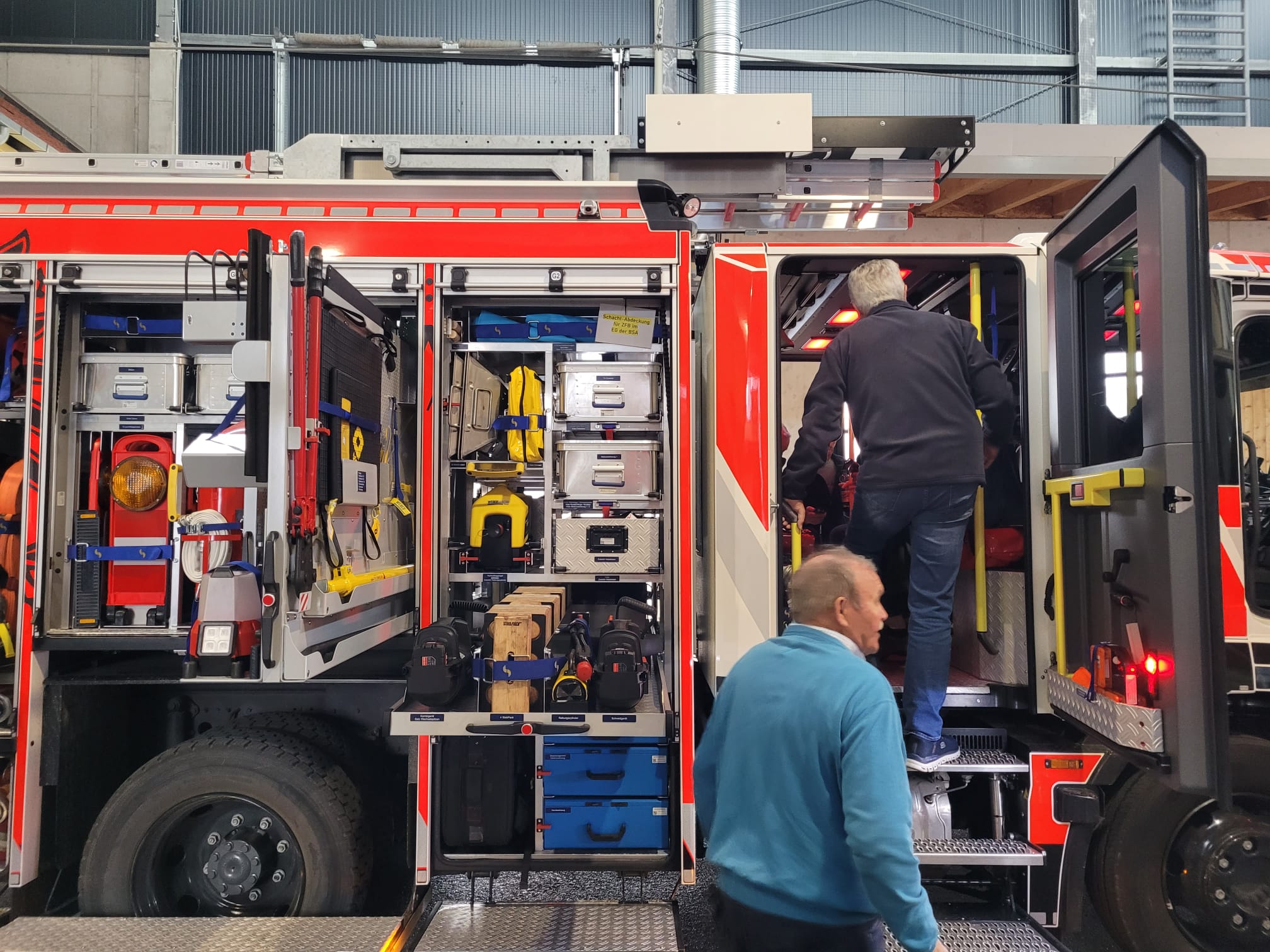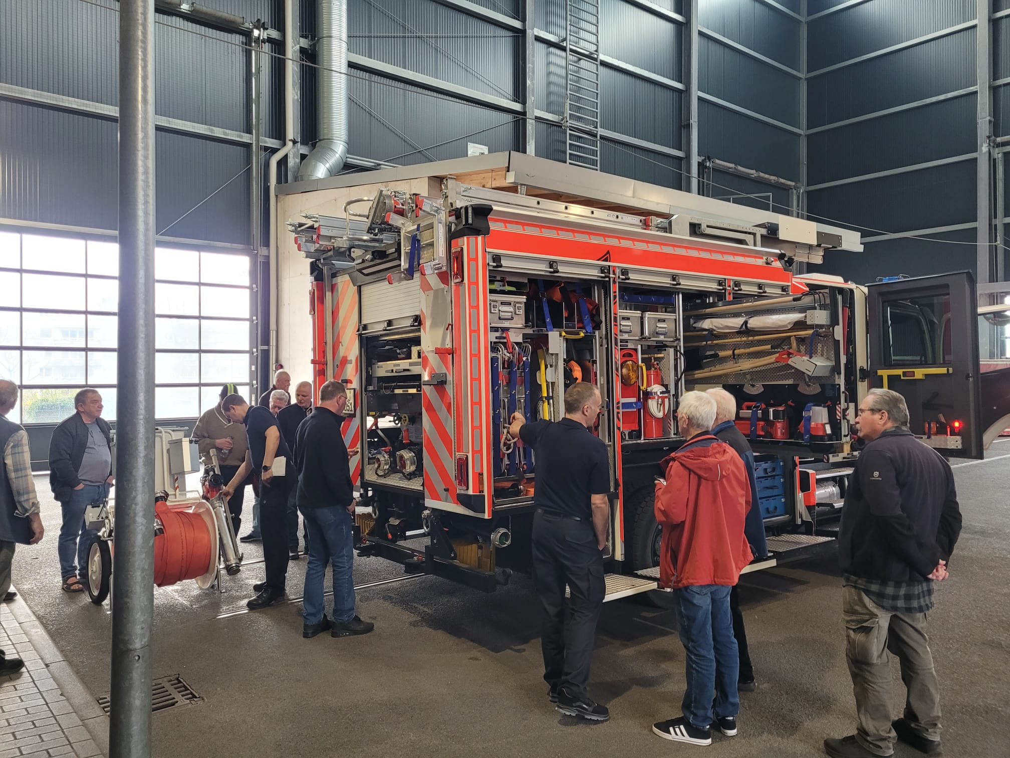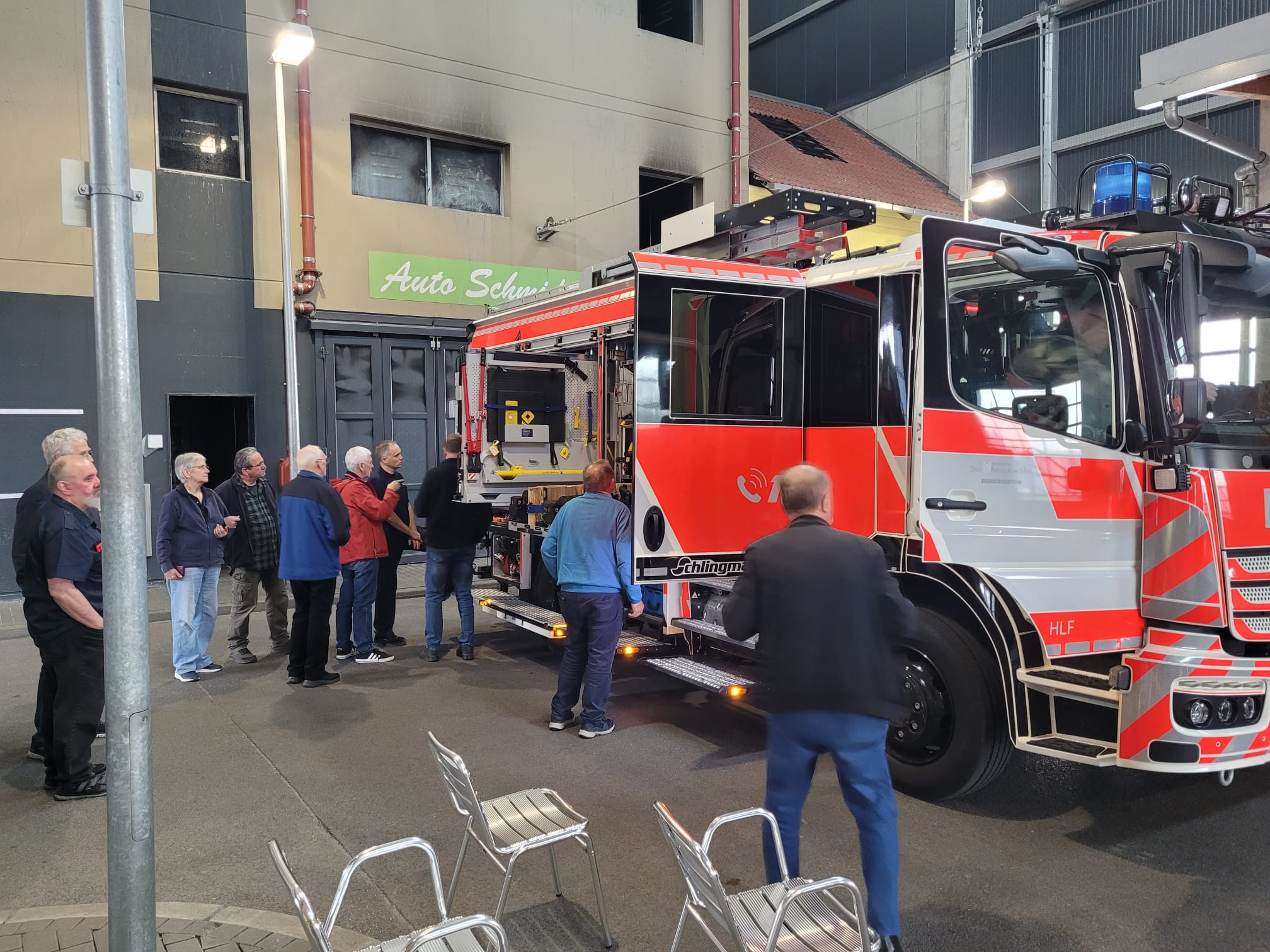 Am 20. März 2026 trafen sich 30 ehemalige Kollegen, um an der Vorstellung des neuen Einsatzfahrzeuges teilzunehmen. Sie staunten nicht schlecht, als sie auf dem Dach des neuen Fahrzeuges die Hakenleiter (französisches Modell) sahen (Vadder Henn, Manfred Himmighofen und CO hätten ihre Freude).
